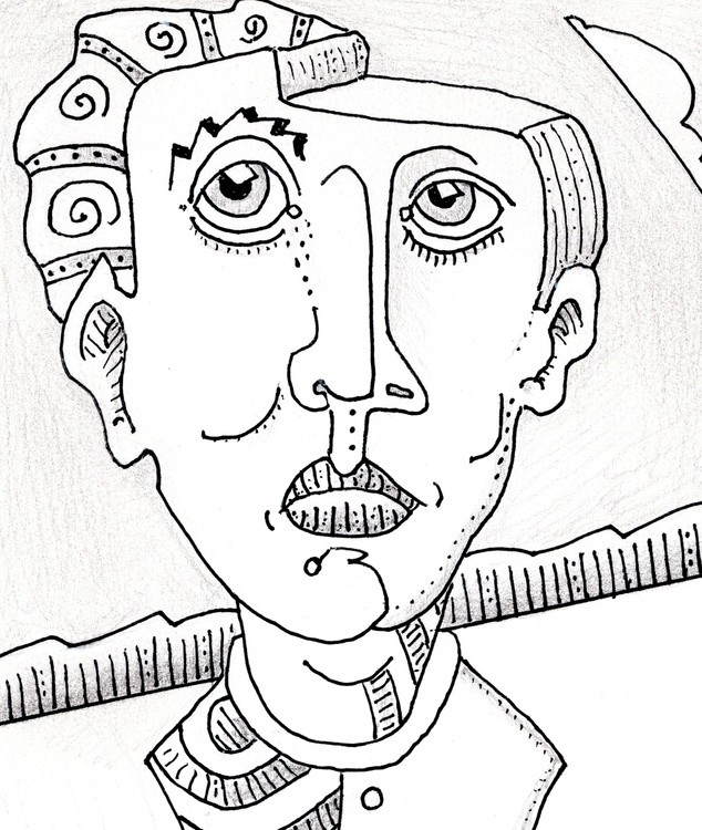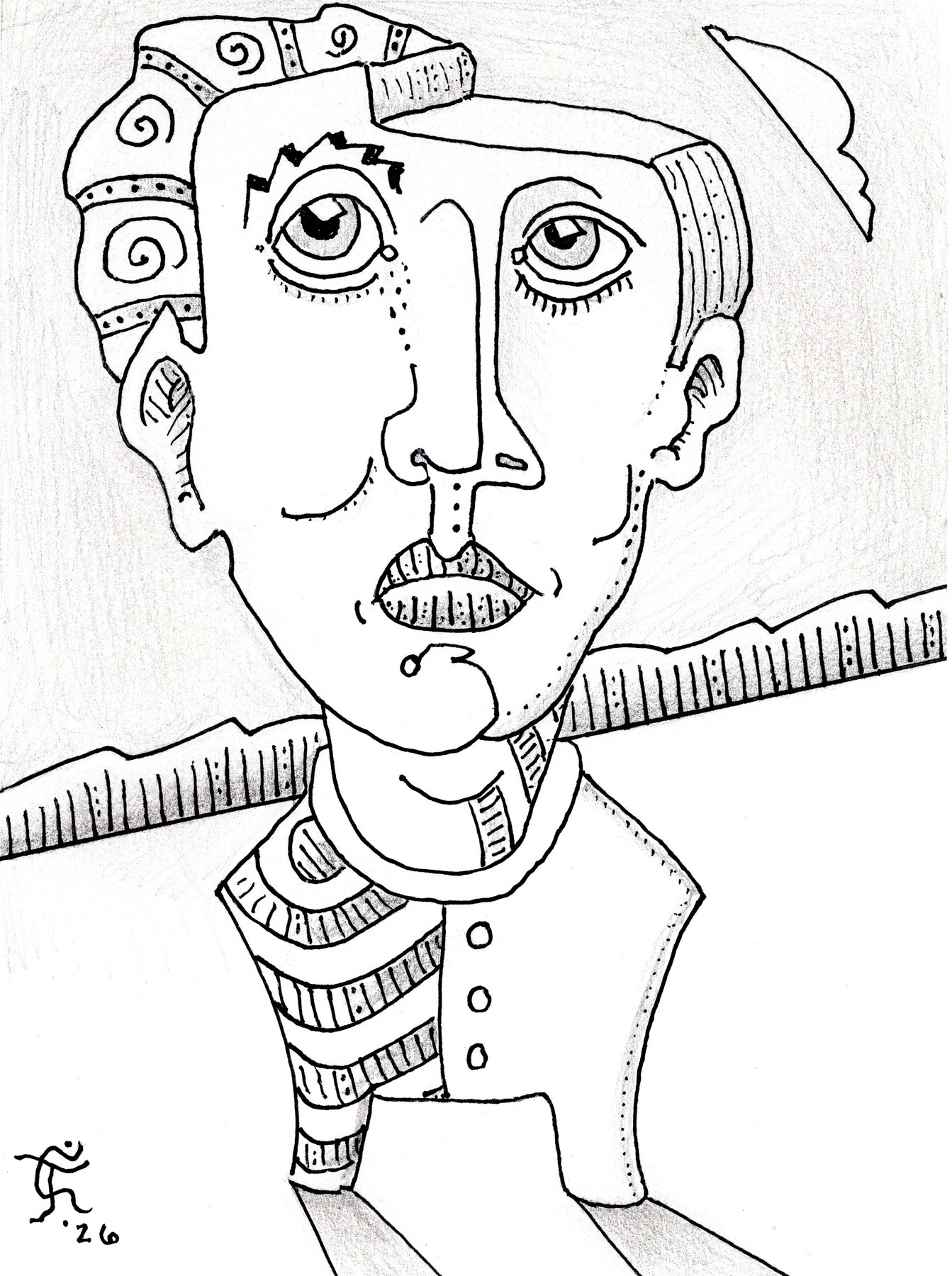 Obviously the barber had his own ideas. This is a 6 by 4.5 inches gel pen with gray Crayola drawing on medium bond acid-free paper. Original Jones Art, still pushing them out here in northwest Austin, Texas.