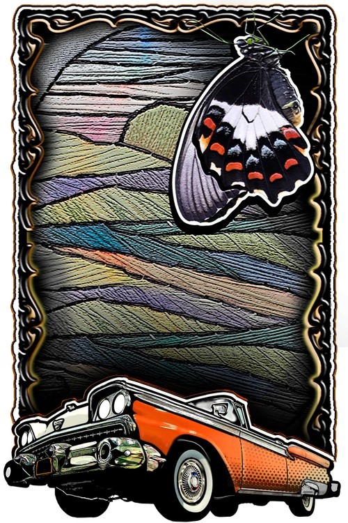 This is an “Orchard swallowtail” butterfly & a 1959 “Ford Galaxi”.