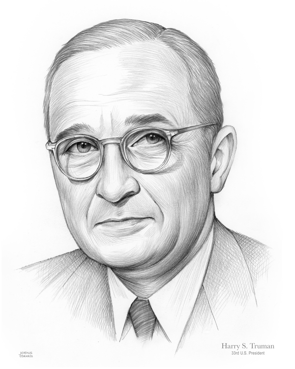 Harry S. Truman (1884–1972), the 33rd president of the United States, led the nation through the final stages of World War II and the beginning of the Cold War. Known for his plainspoken honesty and decisive leadership, he authorized the Marshall Plan, supported the creation of the United Nations, and advanced civil rights at home. Truman’s famous motto, “The buck stops here,” reflected his deep sense of responsibility. This pencil drawing of President Harry S. Truman is by artist Greg Joens. For more portraits and artwork, please visit www.GregJoens.com