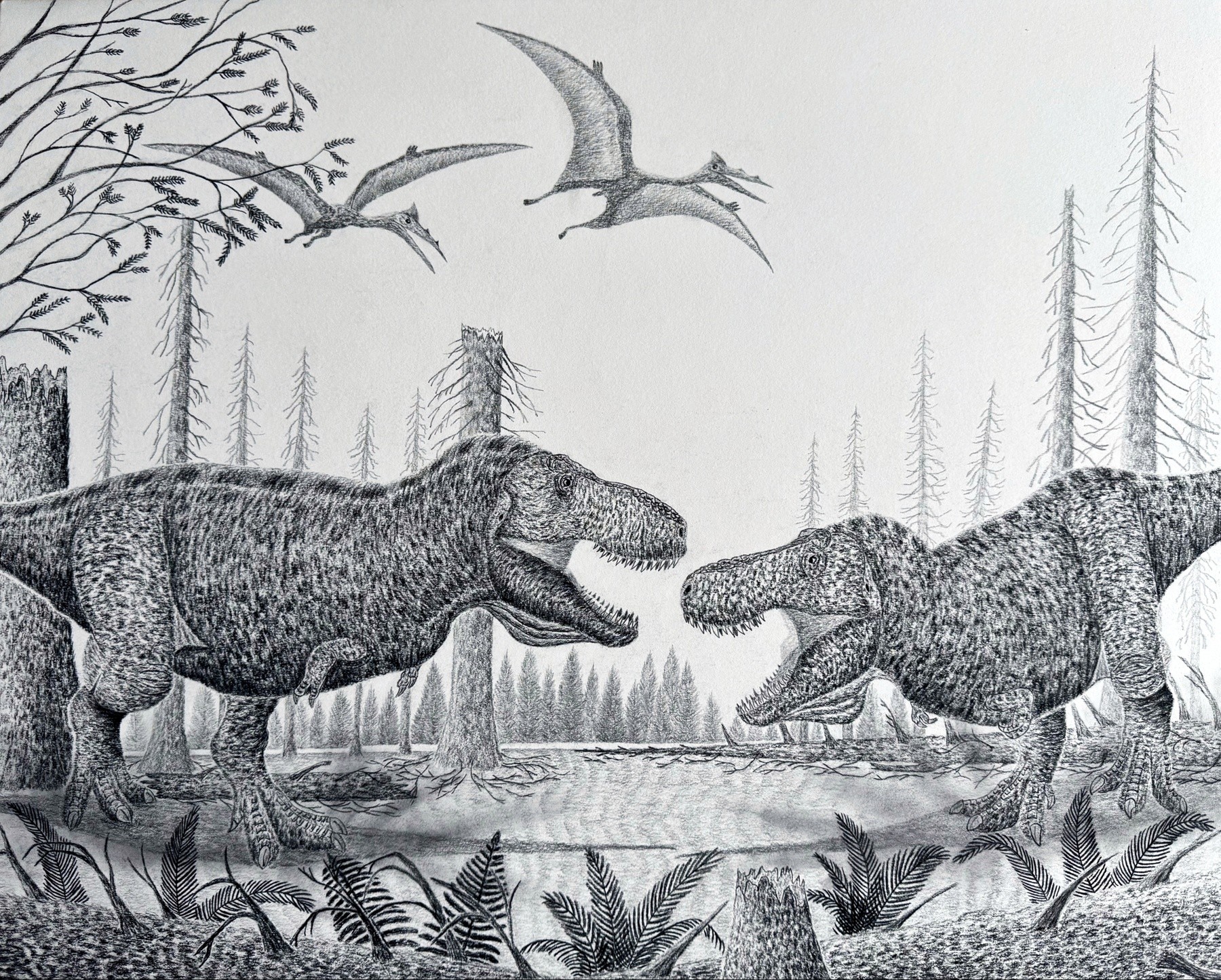 Two male Tyrannosaurus rex in a Late Cretaceous dominance standoff while a pair of Quetzalcoatlus soar in the sky. This artwork was completed in March 2026 on a 16"x20" cold press illustration board using a combination of charcoal and graphite pencils. The dinosaurs were completed in charcoal ranging from HB to 6B while elements of the background were completed in graphite.