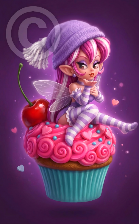 Cupcake Cutie is a fairy who joyfully sits atop a delicious cupcake! She is inspired by my "Sugar Plum Fairy" character and my traditional drawing titled "Cupcake Love," which I created as an ACEO. This new version combines elements from these earlier works, produced between 2008 (Cupcake Love),2010 (Sugar Plum Fairy), and 2026 (Cupcake Cutie), with an updated twist achieved through modern technology and the help of AI. All artworks are ©2008-2026, Terrell Smith-Dorfeo.