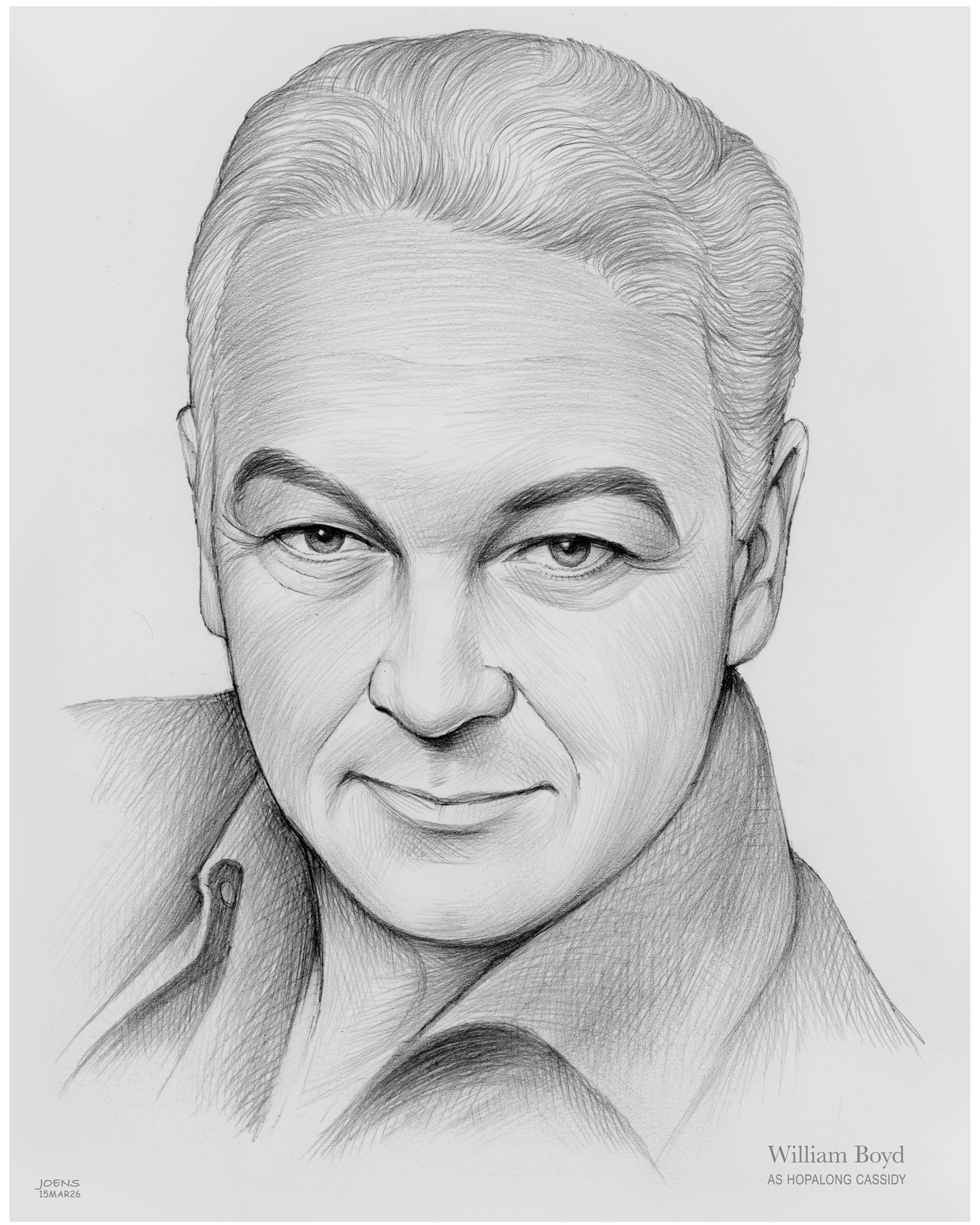 William Boyd (1895–1972) is best remembered for his iconic portrayal of cowboy hero Hopalong Cassidy in classic Western films and early television. With his trademark black outfit and steadfast moral compass, Boyd’s Cassidy became a symbol of integrity, courage, and frontier justice for generations of fans. Beyond his screen performances, Boyd helped pioneer character-based merchandising, transforming Hopalong Cassidy into a beloved cultural legend. His legacy endures in the hearts of Western enthusiasts and film historians alike. The accompanying pencil sketch of William Boyd as Hopalong Cassidy is by artist Greg Joens, whose work can be seen at www.GregJoens.com.
