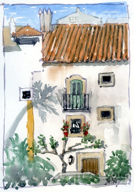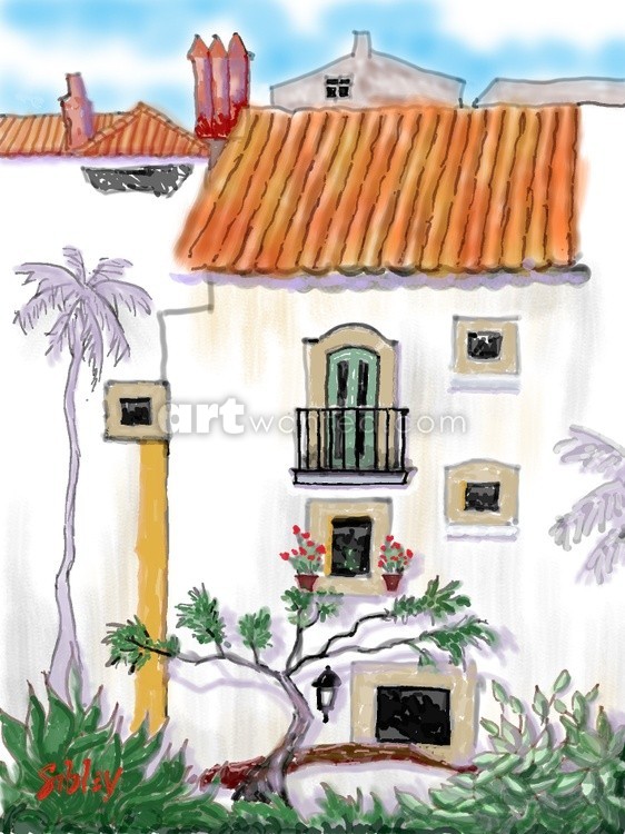 This rendering of "Dwelling" is a digital painting using the original watercolour as reference. The original was painted en plein air in a small town in Portugal. I am attracted to the rustic stucco wall construction, orange tile roof and flowers, lots of flowers and cactus.