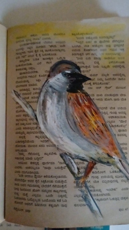 A sparrow—gubacchi—rests lightly on aged paper, its presence delicate yet grounded. The worn surface, marked by time, mirrors the fleeting nature of everyday encounters, where even the smallest visitor leaves a lasting impression.