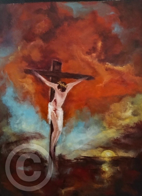 This painting is of the moment when Jesus died, just before the temple is torn in two, The landscape and sky reflect the anguish of His death on the cross. The clouds swirl around, creating a striking background. When I started this painting I wasn't sure how to bring the emotion of the moment forward. Once I laid in the bold oranges and reds, I knew I was onto something.