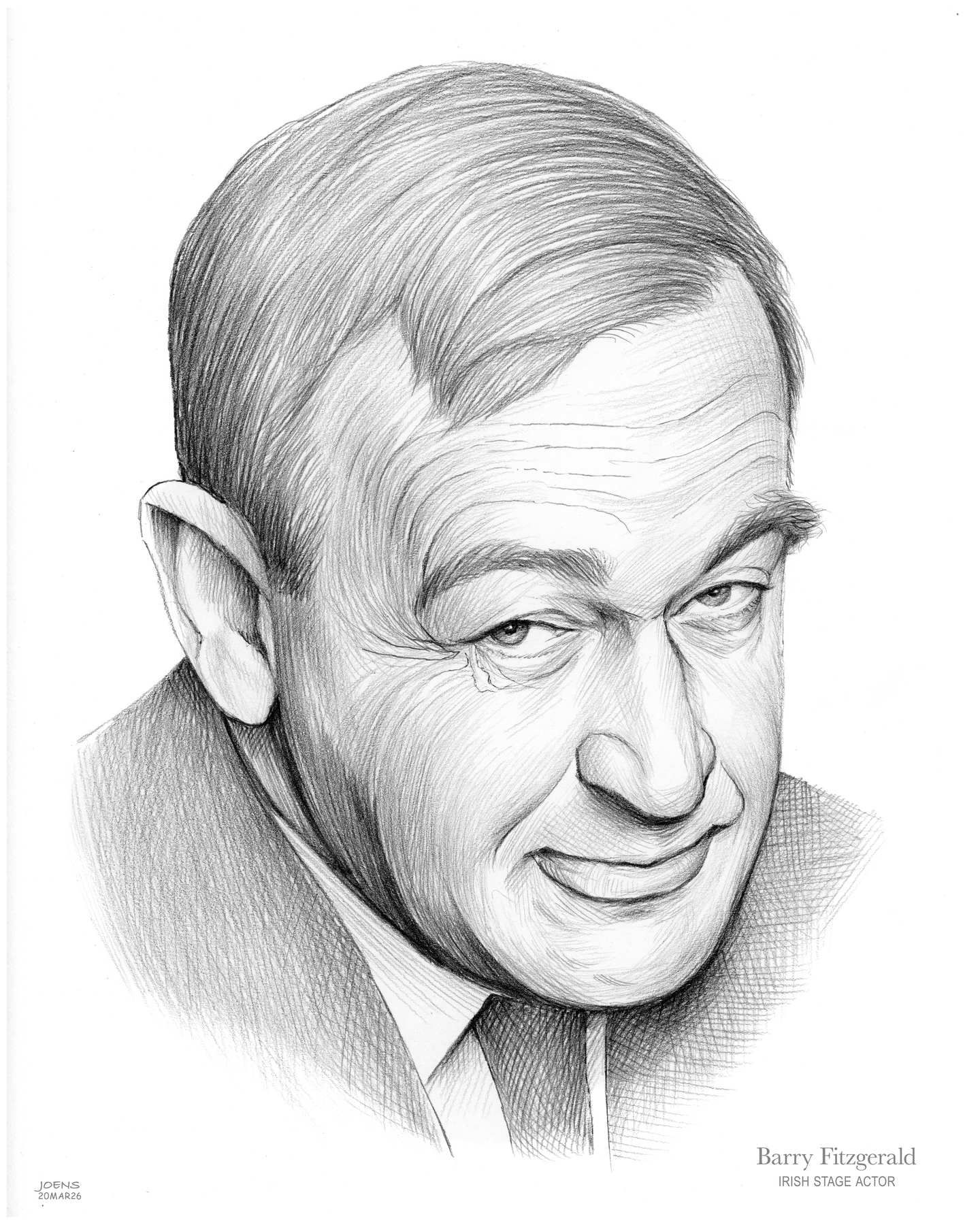 Barry Fitzgerald (1888–1961) was a beloved Irish stage and screen actor whose gentle wit and subtle expression captivated audiences worldwide. Born William Joseph Shields in Dublin, he began his career with the Abbey Theatre, helping define modern Irish drama through nuanced, heartfelt performances. Fitzgerald later moved to Hollywood, where his unforgettable roles in films like Going My Way earned him both an Academy Award and enduring admiration. Known for his warm presence and rich character work, he brought dignity and depth to every role, often portraying humble men of great inner strength. His legacy lives on in classic cinema and theatre history—an enduring testament to his artistry. Detailed pencil portrait by Greg Joens, www.GregJoens.com.