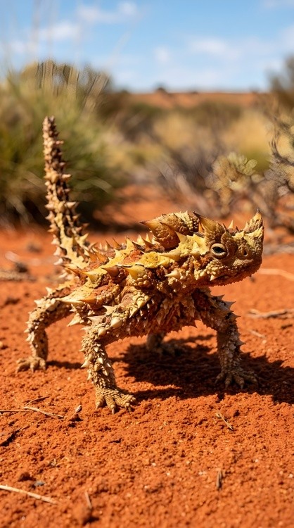 Thorny devil lizard walks across the bright red Australian outback sand showcasing its protective spiky camouflage adaptation.
