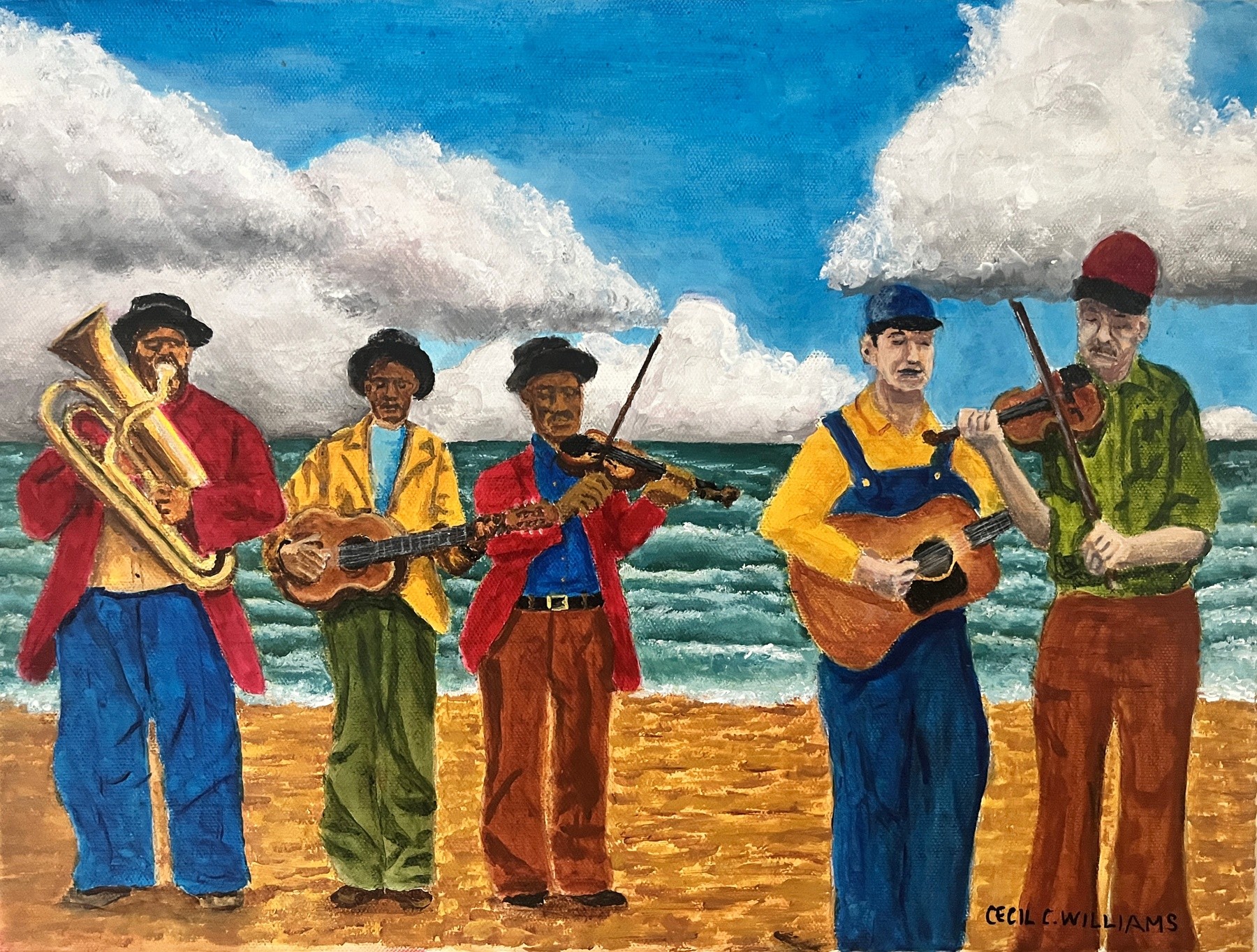 A group of musicians standing on a beach at the ocean. They are playing various instruments guitars, violins and a brass horn. There are two groups made up of diverse people.