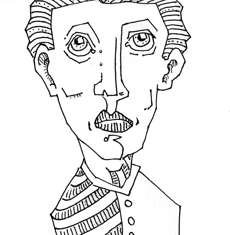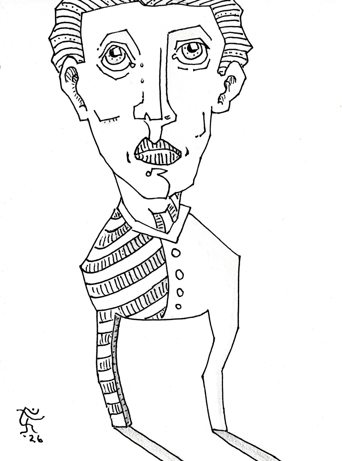 Well, he is rather angular, at that. A simple drawing with gel ink and a a little gray Crayola on 6 by 4.5 inches acid-free paper. Original Jones Art celebrating All Fools' Day with a one-finger salute in the general direction of Washington, D.C. Yeah, I'm still here in northwest Austin, Texas.