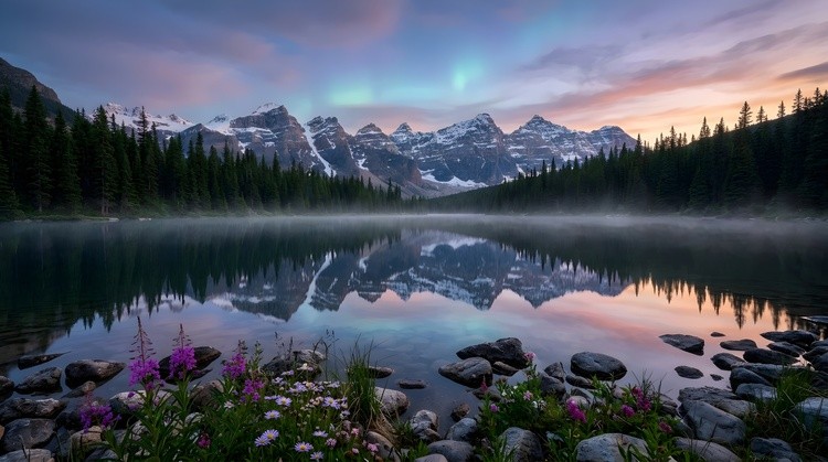 Moraine Lake at dawn reflects majestic snow-capped mountains and dense pine forests in its calm water. A faint aurora borealis shimmers in the pastel sky, enhancing the serene natural beauty of this iconic Canadian landscape with wildflowers on the rocky shore.