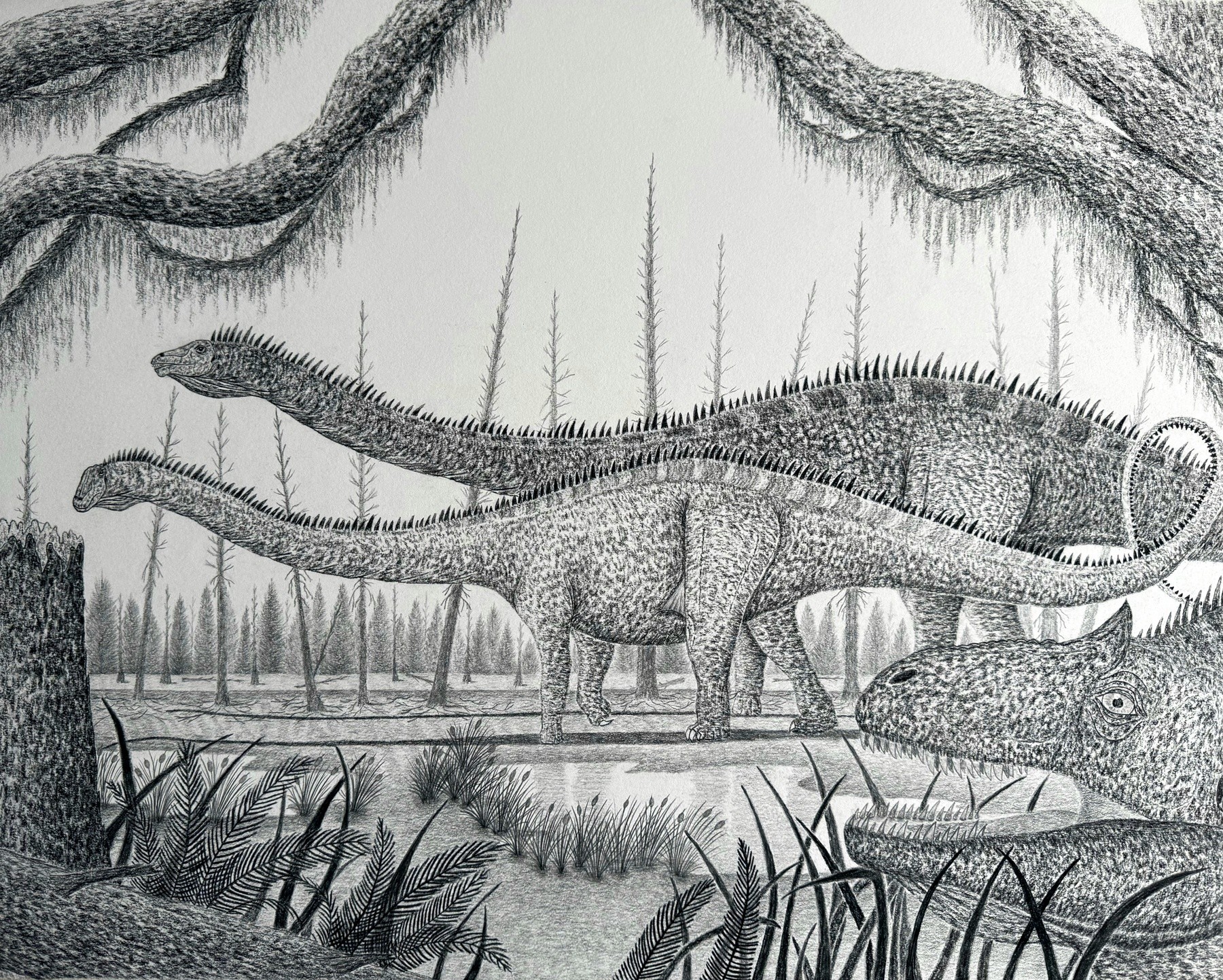 An male & female Diplodocus carnegii on a migration while an Allosaurus fragilis quietly observes in some Late Jurassic vegetation. This artwork was completed in March 2026 on a 16"x20" cold press illustration board using a combination of charcoal and graphite pencils.