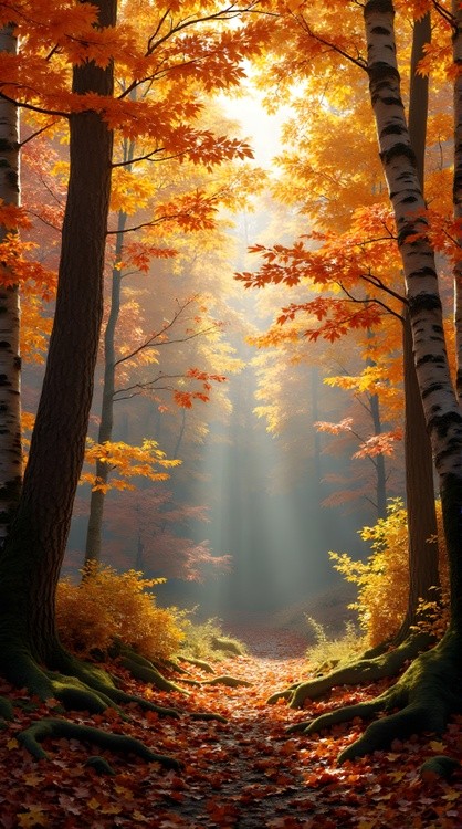 Majestic autumn forest scene showcases golden sunlight filtering through the vibrant canopy of tall trees, illuminating a leaf-covered path flanked by ancient tree roots, creating a wonderfully serene and picturesque natural environment.