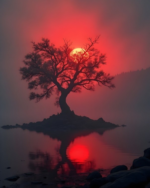 Lone bare tree stands gracefully on a small rock island within calm waters as a glowing red sun sets behind branches creating a vivid reflection in the water that captures the serene beauty of a quiet evening in the natural world.