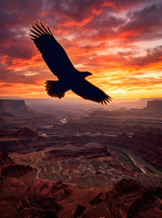 Majestic eagle gracefully soars silhouetted against a breathtaking fiery sunset sky, displaying its powerful wingspan over a vast, rugged canyon landscape with a winding river, symbolizing freedom and natural beauty in the wilderness.