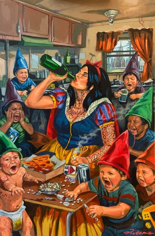 Prince Charming lasted exactly one royal reception and half a champagne toast before “discovering true love” in the palace chamber maid’s broom closet, leaving Snow White still in her dress and already downgraded to a cautionary tale. With no crown, no cash, and a kingdom that treated women like decorative furniture with a pulse, she did what any dethroned princess would do—moved back in with the seven dwarfs, who each, in their own enthusiastic but deeply questionable way, “contributed” to her future. Unfortunately, coal mining turned out to be less of a career and more of a countdown to Black Lung, and one by one they coughed, wheezed, and dramatically exited stage left. Snow White was left holding seven screaming monuments to catastrophic judgment and a mountain of debt stacked higher than a dragon’s credit card bill—only without the dragon, the treasure, or even a decent villain to blame.