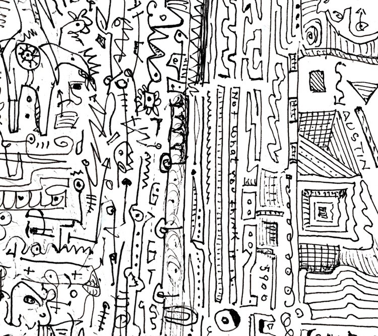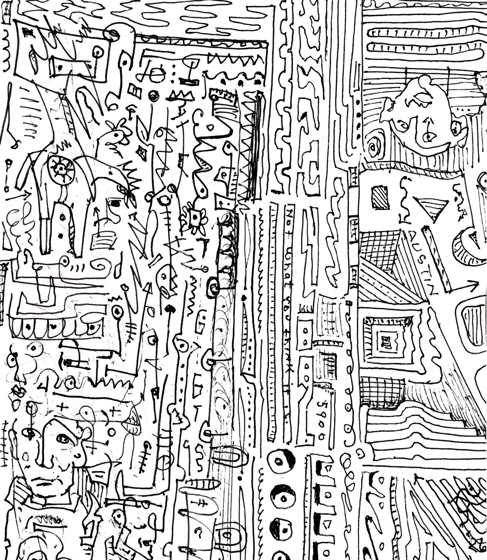 The fourth installment of my backing sheet marks and mayhem. It may be the last in a while. Yes, I know it's heartbreaking. This is a 5.5 by 4.75 inches gel pen drawing on regular bond paper. Is it another time weary example of Original Jones Art limping about northwest Austin, Texas? Well, yes, I suppose it is.