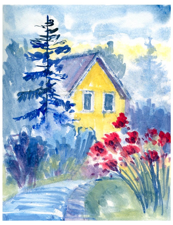 Using snips from photos and paintings previously done, this creation vibrates with colour with the reflection of the sun on the yellow house. The gardens are in bloom on the estate welcoming visitors.
