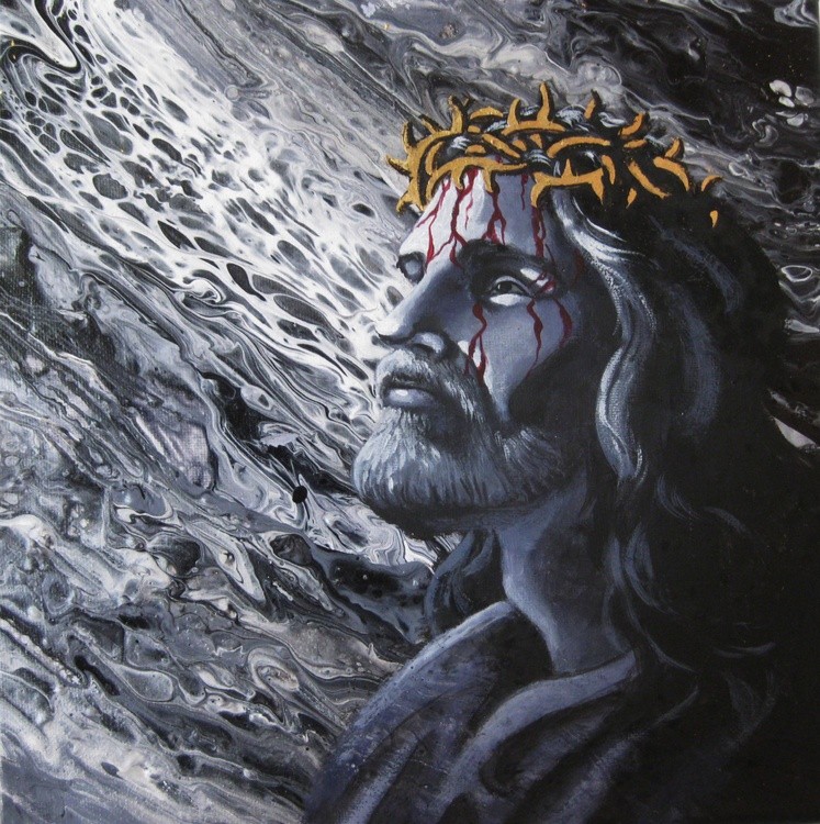 This is a 10 x 10 canvas. I poured the background with acrylic paint, then painted the portrait of Jesus with acrylic paint. The crown is made of gold foil which shimmers in the sunlight. I added a hint of color with the rivulets of blood streaming down his face.