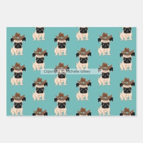 Here is a wrapping paper design I created using my Cowboy Pug artwork. The set of 3 designs is sold on Zazzle. All copyrights will remain with the Artist.
