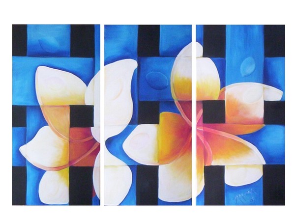 A set of 3 gallery wrapped canvas each 30x60cm. A very popular funky flower with a similar style design as another painting I have done. The colours are rich and vibrant and have a very modern but abstract feel to them. I have added a touch of natures gift water .An original design that I will use again definitely.