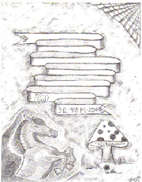 I drew this picture not long after my dad died, I never had art lessons; my dad taught me all I know now. In this picture I have drawn all the things that he liked to draw, the scroll was the first thing I learnt to draw when I was younger. The horse was the last thing that we drew together, but we did not get to finish it; so I did not include it all in the drawing. The drawing has lost most of its detail and is a little blury because I had to make the picture smaller so that it would download properly. I did the best I could to make it like the original.