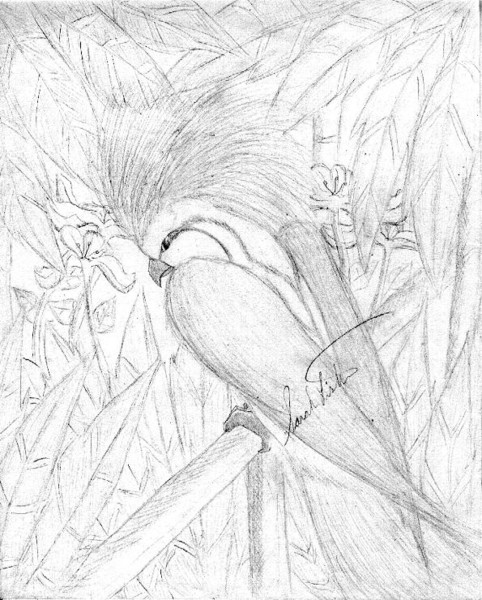 A lovely picture of an exotic bird that I drew one day. It's some form of cockatiel, but I had no particular bird in mind when I drew it, so I could not say a species. The overtly dark patches/lines are due to the antiquity of my scanner, I am very sorry for this!