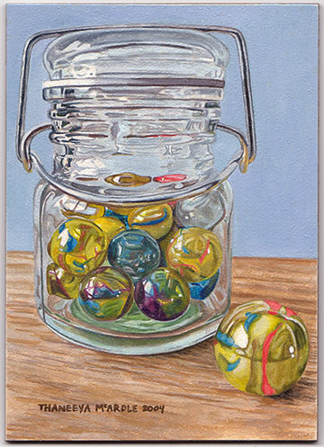 This painting depicts a clear jar filled with a variety of marbles resting upon a wooden table, with one large marble placed outside the jar. With this piece I was interested in analyzing the effects of distortion caused by the glass as well as capturing the play of lights and shadows upon the surface of the objects.
