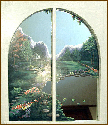 Garden scene with a gazebo and pond hand painted on mirror and placed into an antique, arched window sash.