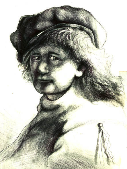 Study of a portait of our own grumpy master rembrandt, done after one of his own. I really love his portait technique of putting the face into shadows...ads something mysterious to the whole thing. Done in watercolor pencil, ballpoint and ink.