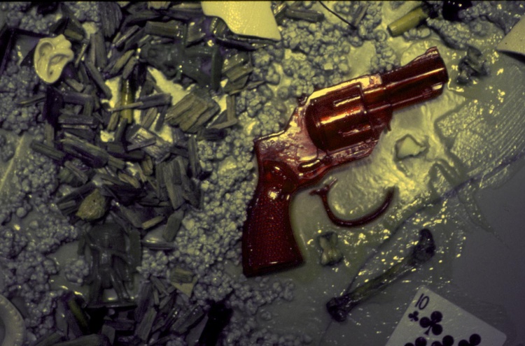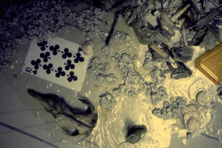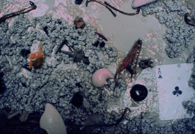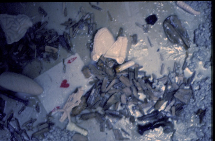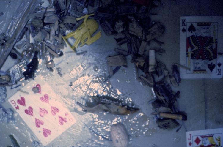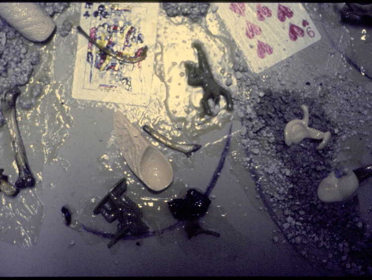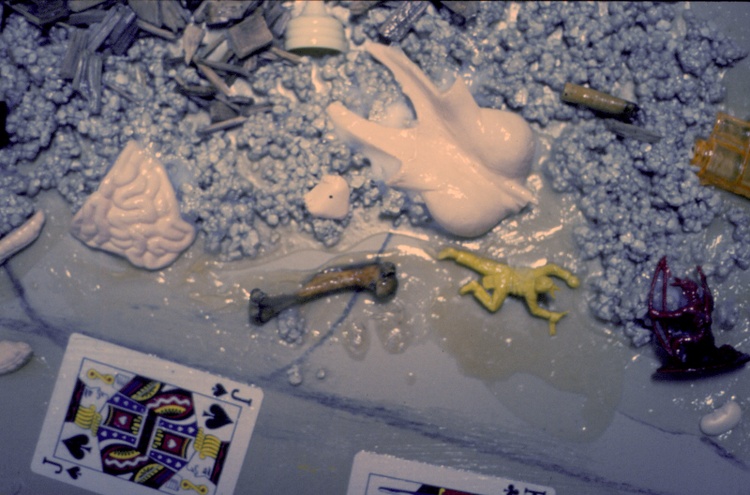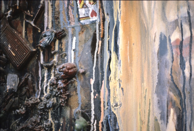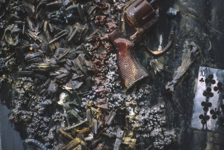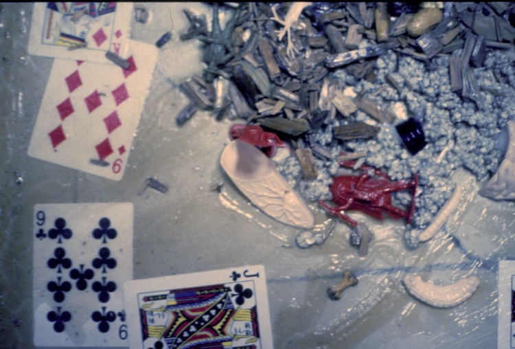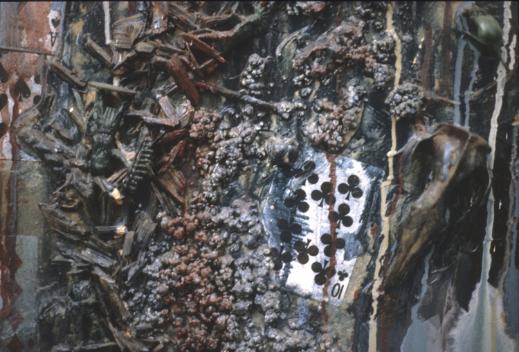 48 in. X 48 in., acrylic, oil, enamel, clay, playing cards, wood chips, bone and plastic toys on panel