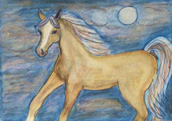 Moon Maiden* 5 x 7 * Original Watercolor on Watercolor Paper * Signed by Artist, Pamela Miller * Beautiful Silver Moon and Light Colored Palomino with a Silver Mane and Tail