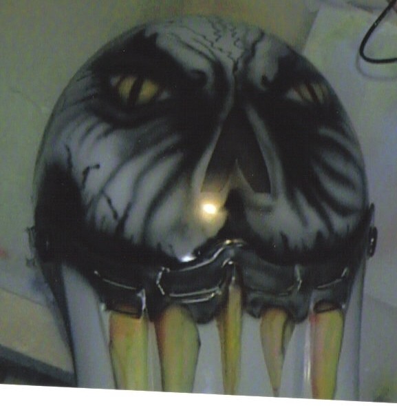 this was the first helmet i painted. you cant see it, but theres big horns painted on the side too. a lot of people kept thinking they were brains though. oh well. this project was a lot of work, but a lot of fun as well.