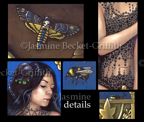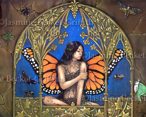 A Fairy Queen and her insect subjects in a beautiful gothic window. Ladybugs, beetles, luna moths, a Death's Head Moth, all kinds of insects! 30"x24" acrylic painting on canvas. © 2006 by Jasmine Becket-Griffith. All rights reserved. Do not use for any reason without express permission from the artist.
