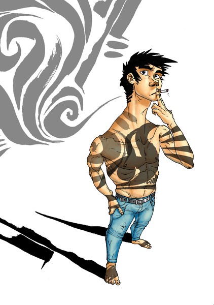 fa-la-la, so this guy has some lively tattoos, no? anyhoo, drawn in ink, tattoo patterns done in india ink and overlaid as "textures", and man general colors done in Photoshop.