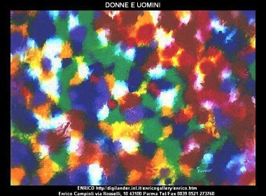 comment: Women and men, and, Men and women have a twin picture (). The work in its complex is therefore composed from two pictures. The two paintings are specular, that is as seen to the mirror. That refers to the difference, and to the complementariness, between the man and the woman, from which the title it. In the vision of the author they are represents to you, observes to you, men and women from above who dance in a hall of the festivities. The way in which the color it is spalmato on the burlap remembers, like visual effect, the impressionismo. ENRICO makes a homage to the impressionismo painting this work, and creates what he could himself be defined: the abstract impressionismo. by EtiPa