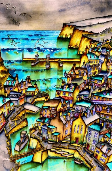Colourful image of the atmospheric fishing village in N. Yorks that has become an artist's community. The cottages tumble down to the harbour and beck which you access via the numerous ginnels and snickels. If you have not been here you must visit but on a sunny day. The beach is great for children with exciting rockpools at low tide.