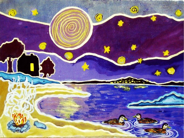 acrylic on paper - 10X14 This piece was inspired by a fire my middle son and I made near the ocean b/c the lighthouse park was closed. So i had promised we could cook out at night by the ocean. we did. And i said 'It's time to P&SS on the fire' some kind of stupid expression and i turn around and see smoke coming up from the fire area and there he was - going on the fire. Guess we have to watch how literal our expressions are around kids... It was a pretty night, though..