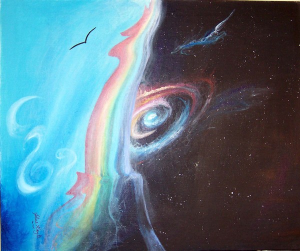 To me this picture is day and night Earth and space timeless limitless It makes me want to hover or fly in space and wrap myself in this rainbow blanket