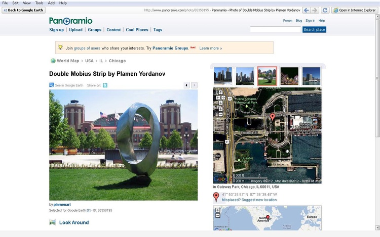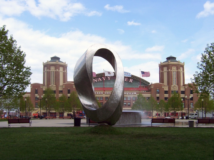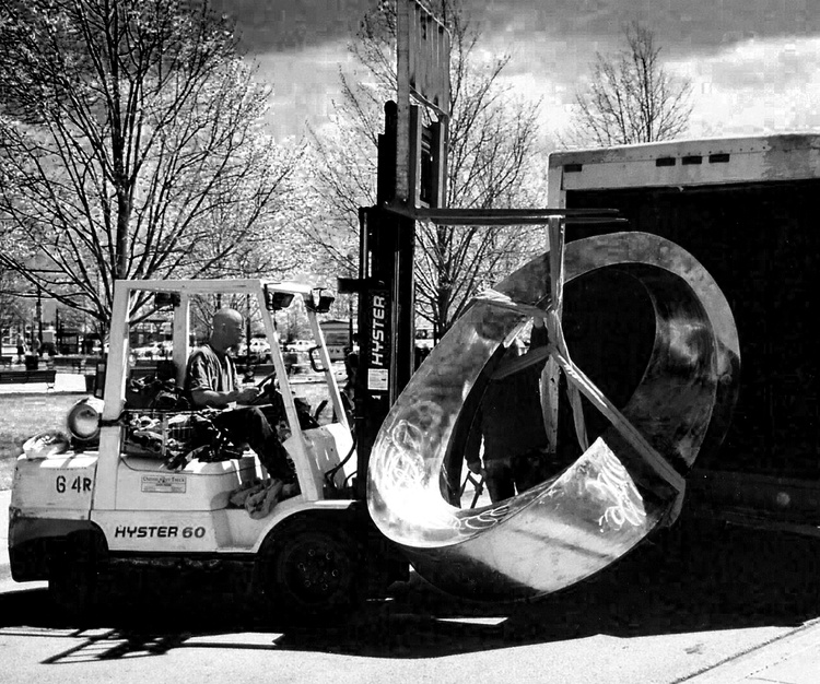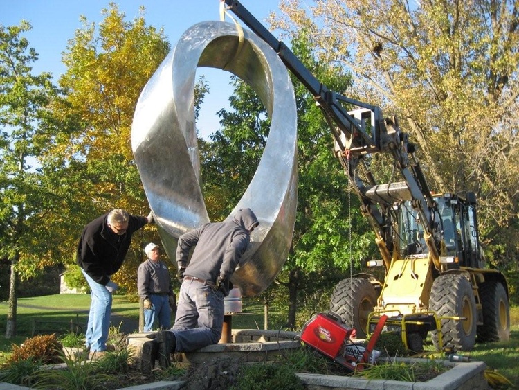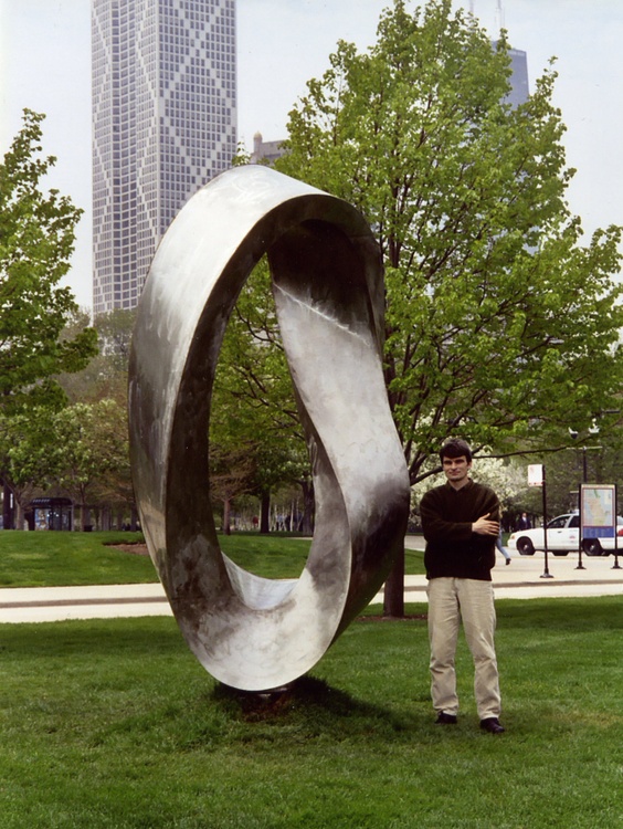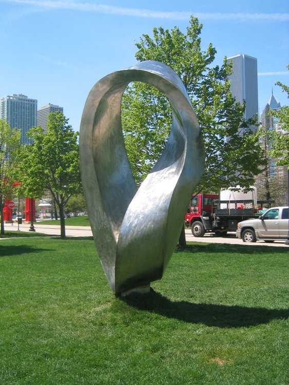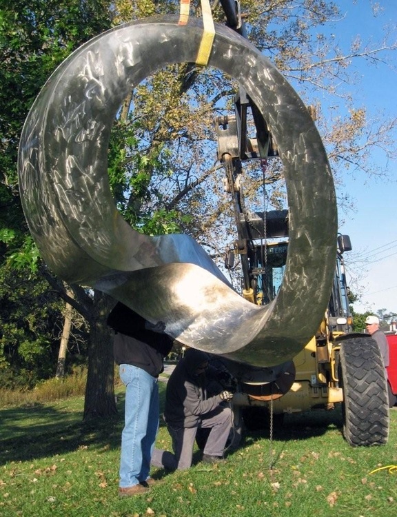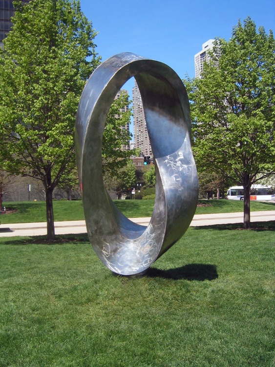 stainless steel, 16 x 5 x 4 ft. The Möbius strip is a surface with only one side and only one boundary component. In this work I combine two Mobius strips together with common edge. The result is one "double" rich and fascinating 3D form, representing the idea of continuance and endlessness of life... https://en.wikipedia.org/wiki/M%C3%B6bius_s trip