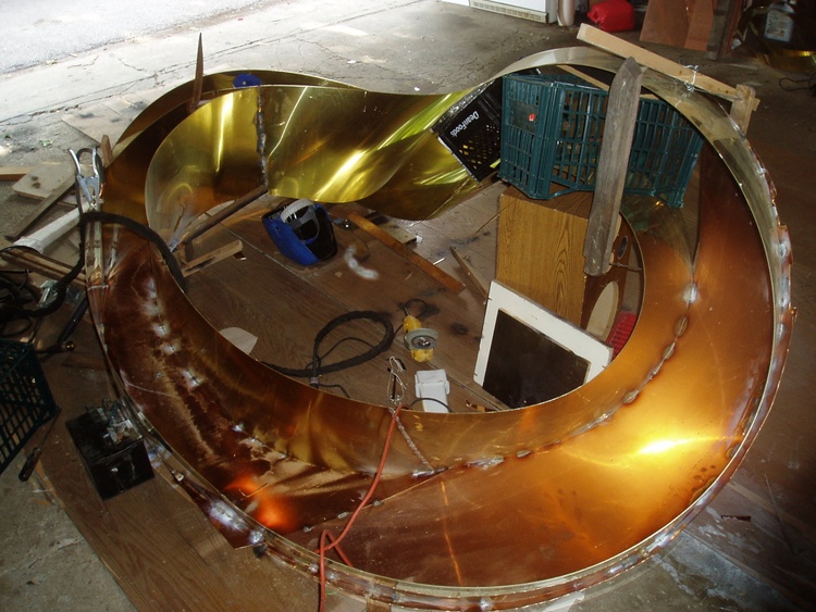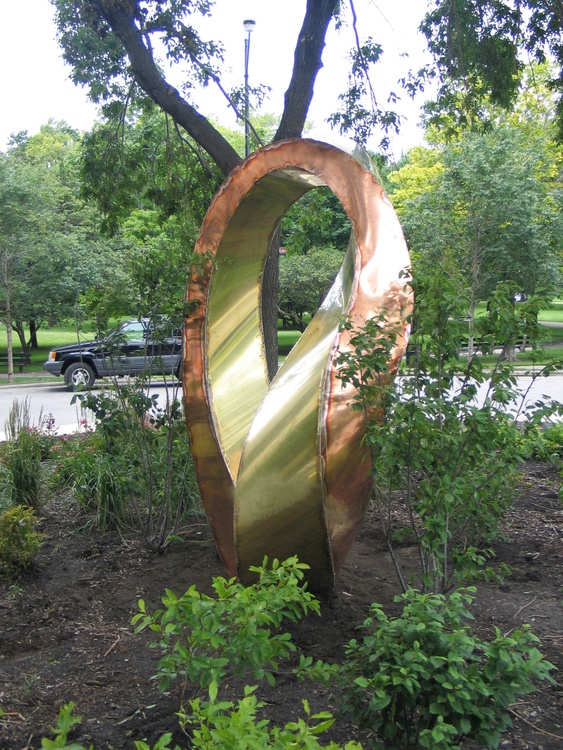 bronze, patina, 14x5x4 feet The Möbius strip is a surface with only one side and only one boundary component. In this work I combine two Mobius strips together with common edge. The result is one "double" rich and fascinating 3D form, representing the idea of continuance and endlessness of life... https://en.wikipedia.org/wiki/M%C3%B6bius_s trip