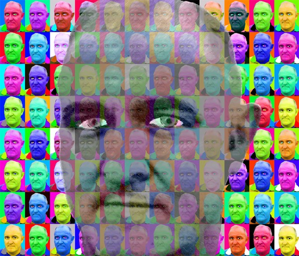 The elements of Andy Warhol's treatment of famous photographs ("Marilyn") by solarization with bright, wild colors applied to my self-portrait.
