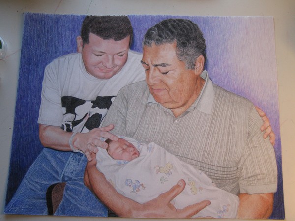 This is a colored pencil portrait of my husband, his father and our new son. I loved this picture showing the three generations. I had to capture this moment. Picture is done in colored pencil on regular drawing paper, 16x20.