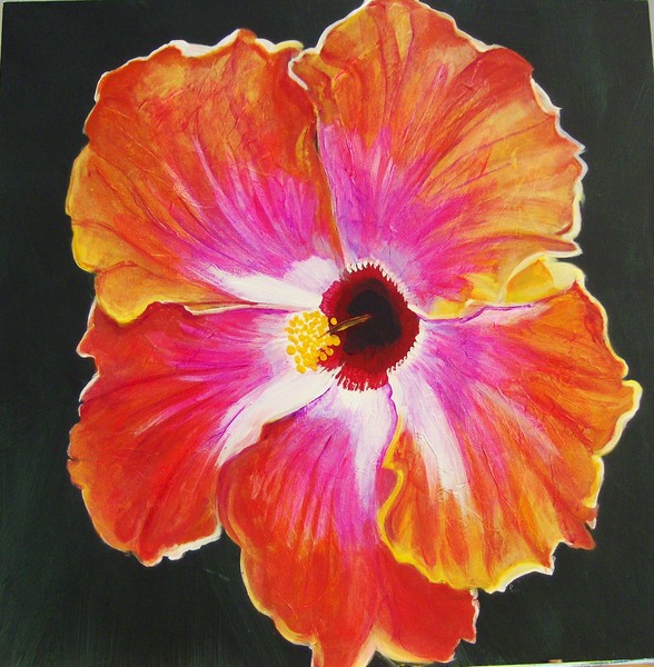 Large solo Hibiscus.. done on primed board with tissue ground on flower petals.. painted and glazed with acrylic. 24" x 24" with a 2 " boxed frame, doesn't need framing.. can be hung, already wired and sealed in high gloss finish. These hibiscus are growing at my fathers house in Florida,, I can't believe some blooms are actually bigger than my head.