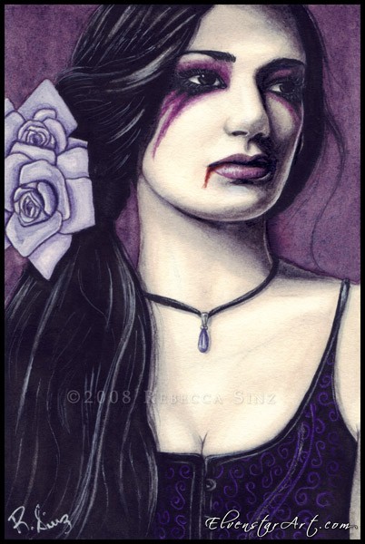 A vampire in a purple twilight setting. Watercolor, white goauche and colored pencil. 4 x 6"