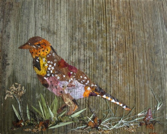 Bird is sitting on ground and it appears from expression that...bird watching something eatables through smell. 'Collage' made from all natural materials like colorful dried flowers leaves twigs petals etc.on Canvas that too a treated bark of palm tree leaves.