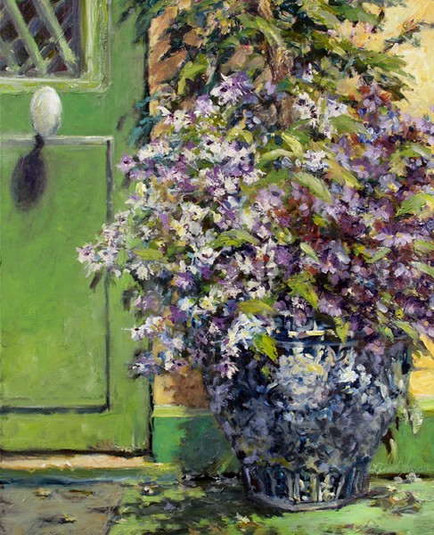 30x24 in. Painting of a gloriously, festive-colored planter at the foot of one door of Claude Monet's house in Giverny, France. Copyright 2008, L. Diane Johnson