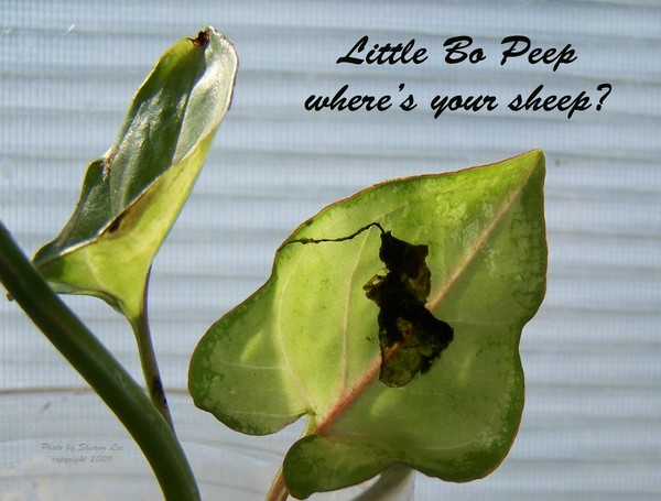 I was standing at my window one day and I noticed that the little plant I was trying to get started had an unusual character on it's leaf. At closer look, I decided that it was Little Bo Peep, with out her sheep. What do you think? Photo by Sharon Lee. Copyright 2009