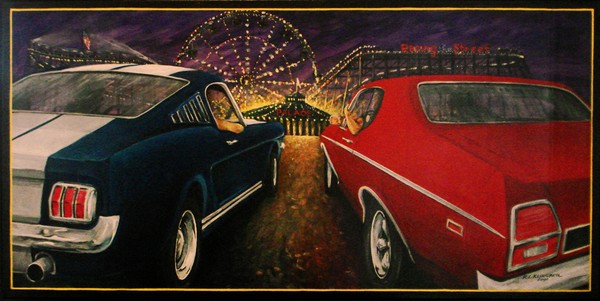 This 24"x48" painting on gallery wrapped canvas is another in my "springsteen series" I wanted this to be little more than a fun uplifting painting, with the feel of carefree summers spent with good friends and fast cars.