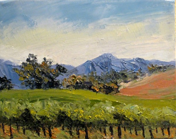 This vineyard is out in the Valley of the Moon. I snapped a picture of it as I was driving since there is nowhere to pull over, park, and paint. It's all done with a pallette knife. Copyright 2009.