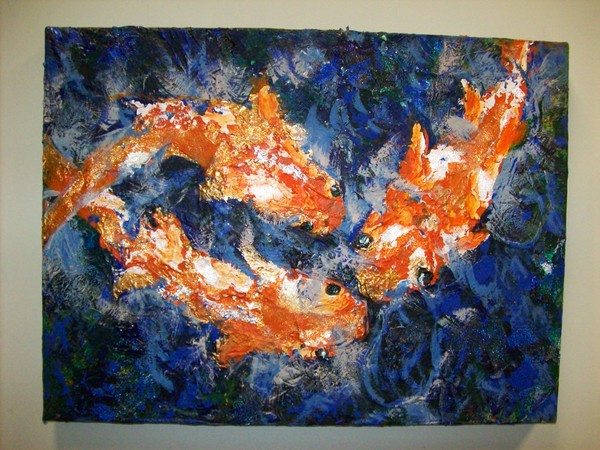 Acrylic and paper collage. Popular subject Koi fish. Original on canvas